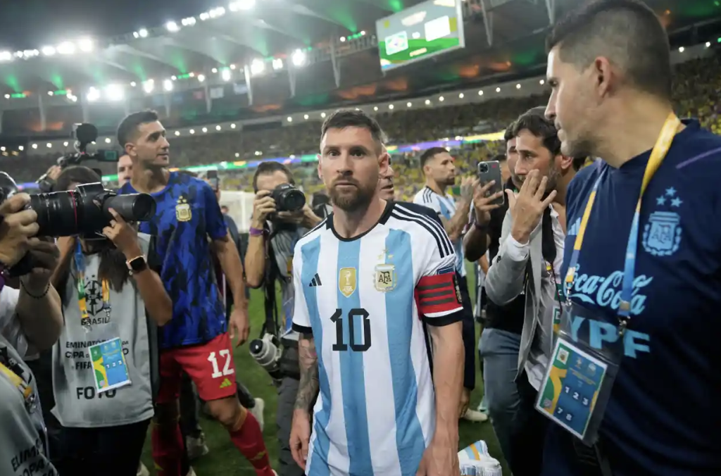 The Argentina team, led by captain Lionel Messi, went over to the terraces to try and calm the situation before leaving the pitch and returning to the dressing room.