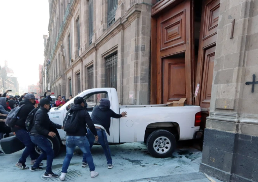 Protesters in Mexico City drove a pickup truck through the door of the presidential palace, where President Andres Manuel Lopez Obrador was holding a press conference. Police responded by using tear...