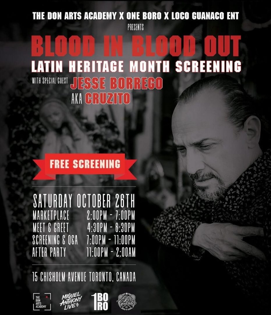 Blood In, Blood Out fans are in for a huge treat. Jesse Borrego (Cruzito) will be in Toronto at The Don Arts Academy as a finale to our annual Hispanic Heritage Month celebrations.