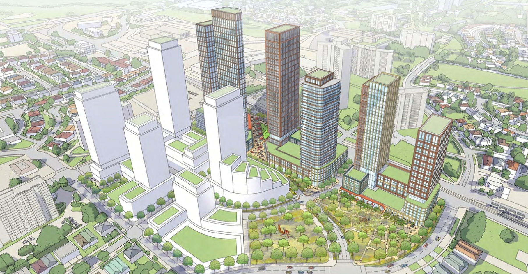 BARRIO (Urban Toronto) – A notable trend in mall redevelopment is taking shape in the Greater Toronto Area, whee the owners of shopping centres seek to redevelop with much greater density, particularly adding residential space. They are found across the GTA — from Cloverdale Mall, to Galleria on the Park, to Pickering City Centre — with many more, and are now being joined by the proposed Jane and Finch Mall Redevelopment. Designed by BDP Quadrangle for Brad-Jay Investments Ltd, the Official Plan Amendment and Zoning By-Law Amendment applications for the north end of the Glenfield-Jane Heights neighbourhood.