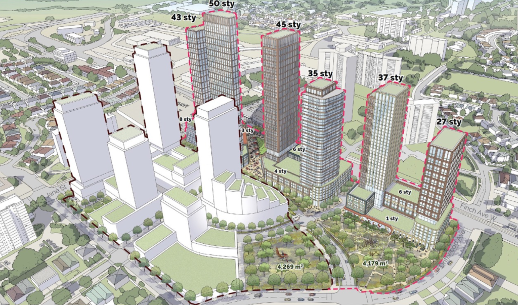 The redevelopment’s location alongside the upcoming Finch West Line 6 is pivotal in its design and function. This LRT line, spanning 11km with 18 stops and expected to open later this year, is one of the next big steps in Toronto’s transit expansion, enhancing connectivity across the city’s northwest corridor. Two of these stops, at Jane Street and at Driftwood Avenue, are situated adjacent to the site’s northeast and northwest corners. This immediate proximity positions the development within the stops’ Protected Major Transit Station Areas (PMTSAs), so the redevelopment is designed as a transit-oriented community.