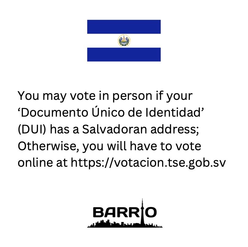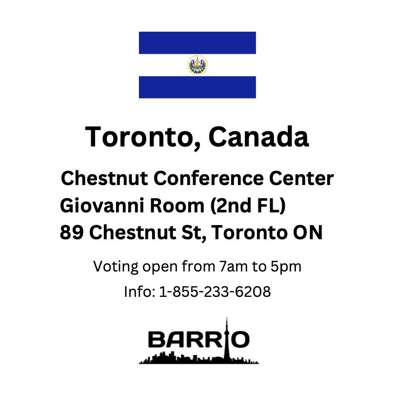 If you can get to Toronto, and if your ‘Documento Unico de Identidad’ (DUI) has a Salvadoran address you can vote at the location above; Otherwise, you will have to vote online at https://votacion.tse.gob.sv